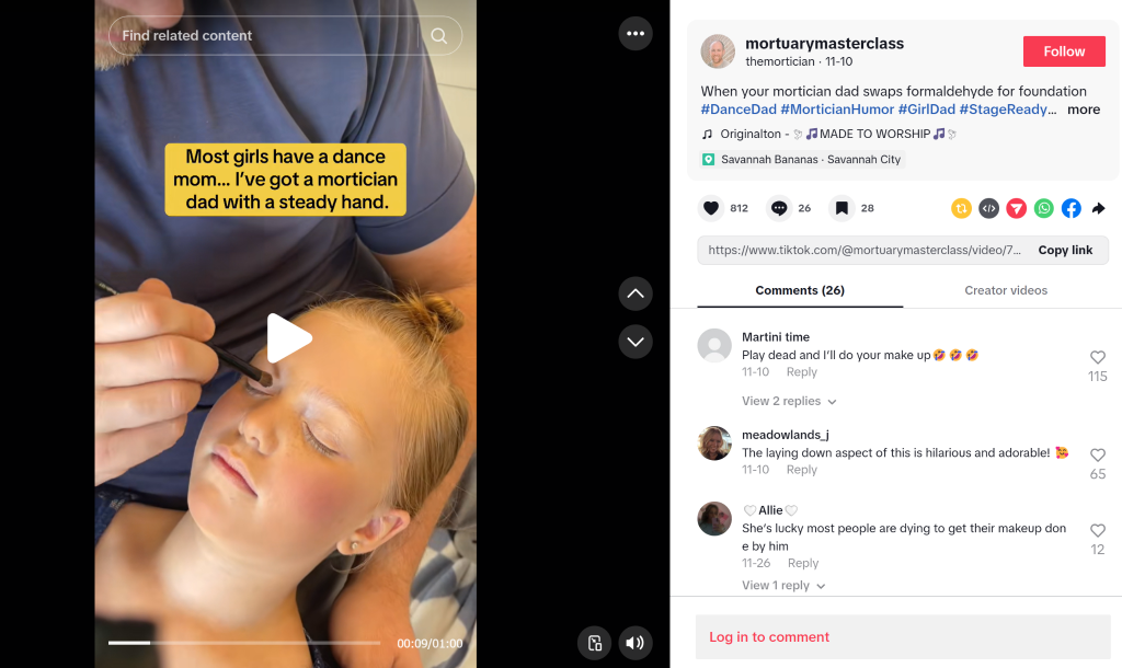 Tennessee funeral director Aaron Rowbury has gone viral for showing that his “mortician skills” aren’t valuable only in an embalming room. Rowbury recently posted several super-cute TikTok videos of himself applying makeup to his daughter for a dance recital — in the best way he knows how. “Most girls have a dance mom … I’ve got a mortician dad with a steady hand,” he wrote across the video. The caption reads “When your mortician dad swaps formaldehyde for foundation.”