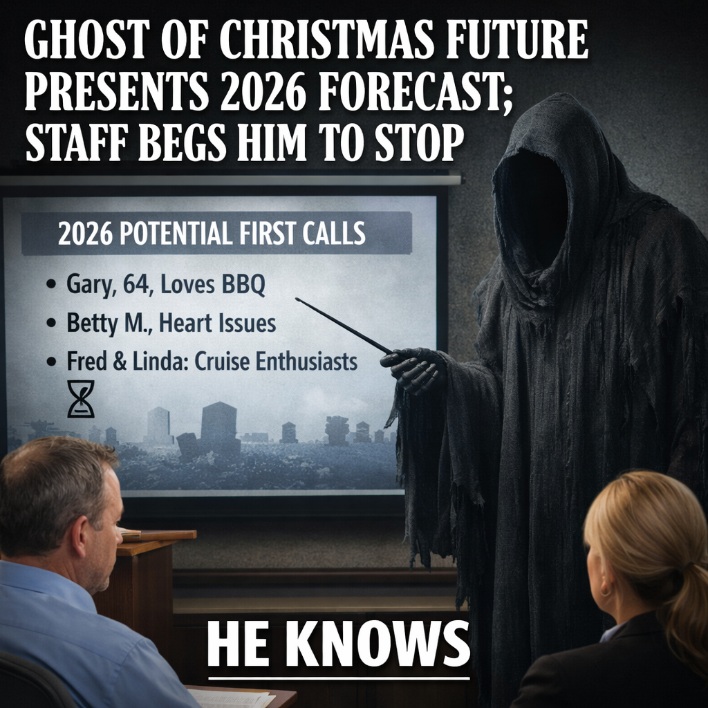 Mild Oaks Memorial Chapel got an uninvited visitor this week when the Ghost of Christmas Future appeared in the arrangement office at 7:02 a.m. and asked, politely, if they had a chair that didn’t squeak “like regret.” Staff assumed it was a new consultant until he raised one bony hand and the wall filled with a glowing list titled POTENTIAL 2026 FIRST CALLS.