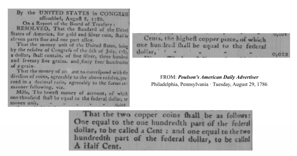 1786: The U.S. Congress resolves to create the first American money units, including the “highest copper piece, of which one hundred shall be equal to the federal dollar.”