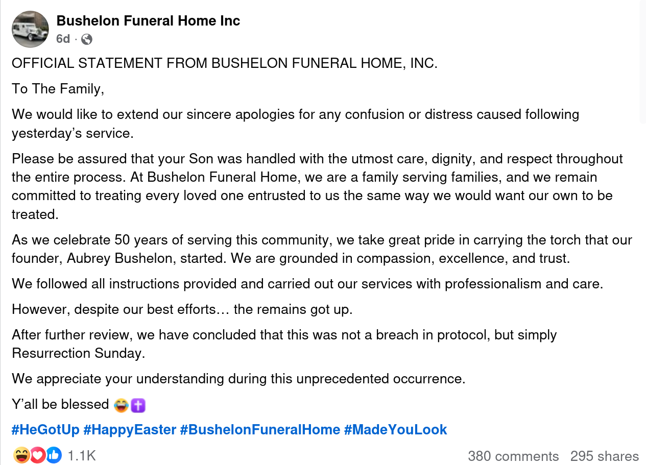 A Birmingham, Alabama funeral home’s well-timed Easter Monday Facebook post has gone viral, sparking hundreds of comments, a few AI-generated memes, and a whole lot of good-natured attention: